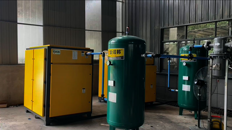 这是两台55千瓦永磁变频二级压缩螺杆空压机,都是一级能效后处理。配一台冷干机四个储气罐过滤器,依靠两台主设备共用一套后处理压缩空气管道采用铝合金超级管道。两个师傅齐上阵,顶着高温给客户安装,现已安装完工,开机运行稳定,顺利交付使用。
